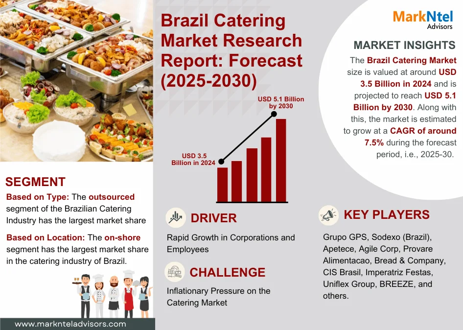 Brazil Catering Market Overview: 2025-30 Base Year: 2024 Historical Years: 2020-23 Forecast Years: 2025-30 TheBrazil Catering Market size is valued at around USD 3.5 Billion in 2024 and is[more...]