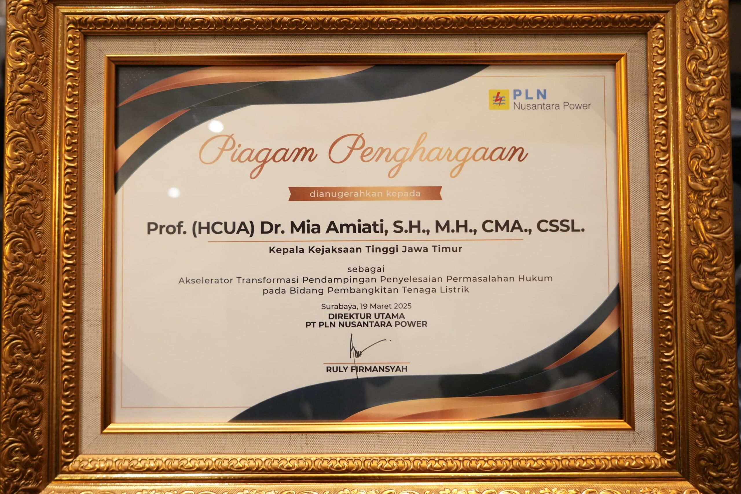 SURABAYA, Kamis 20 Maret 2025 – Kajati Jatim, Prof. (HCUA) Dr. Mia Amiati, SH, MH, CMA, CSSL bersama-sama dengan para pejabat utama dan para Jaksa Pengacara Negara (JPN) menghadiri acara silaturahmi dan Buka Bersama dengan PLN Nusantara Power (PLN NP). Selain dihadiri oleh Dirut PLN NP Bapak Rully Firmansyah, acara ini juga dihadiri oleh para Pejabat Utama di lingkungan PLN NP serta para Direktur dari seluruh anak perusahaan dan yang terafiliasi dengan PLN NP (Rabu, 19/03).